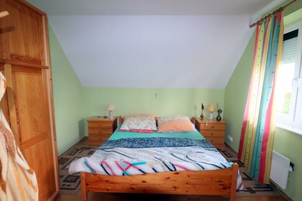 Dom jest parterowy z użytkowym poddaszem, niepodpiwniczony. Na parterze znajduje się przestronny salon z aneksem kuchennym, łazienka z WC oraz praktyczna spiżarka. Na piętrze zlokalizowano 3 pokoje oraz kolejną łazienkę. Całość została zadbana i utrzymana w dobrym stanie.