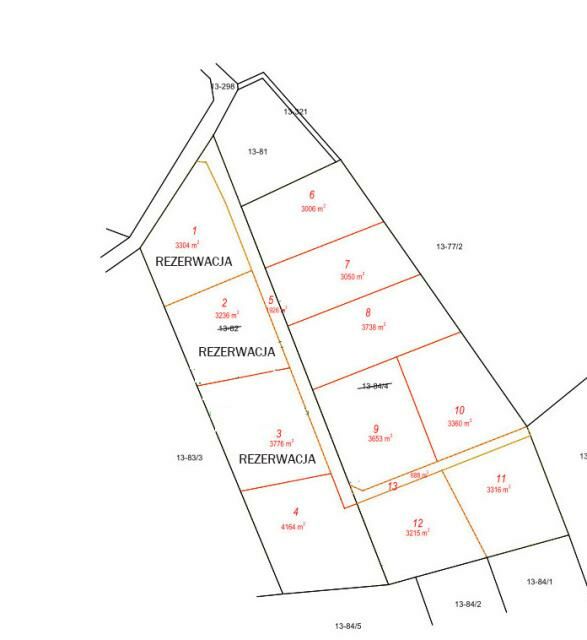 Kompleks 12 działek o powierzchni od 3006 do 3738 m2. Numery działek 84/1 do 84/12.